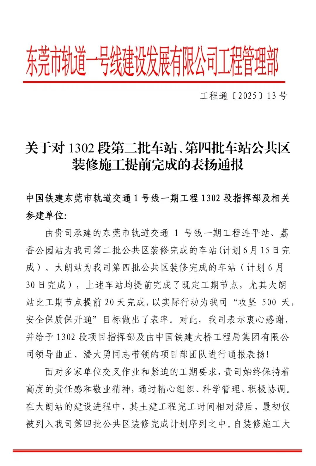 近日,東莞地鐵1號(hào)線指揮部收到東莞市軌道一號(hào)線建設(shè)發(fā)展有限公司發(fā)來的表?yè)P(yáng)通報(bào)。通報(bào)對(duì)東莞地鐵1號(hào)線1302段連平站、荔香公園站、大朗站提前完成既定工期節(jié)點(diǎn)表示肯定,特別是大朗站較原定節(jié)點(diǎn)提前20天完成,大幅提前實(shí)現(xiàn)關(guān)鍵目標(biāo),以實(shí)際行動(dòng)為保障全線開通作出了表率。